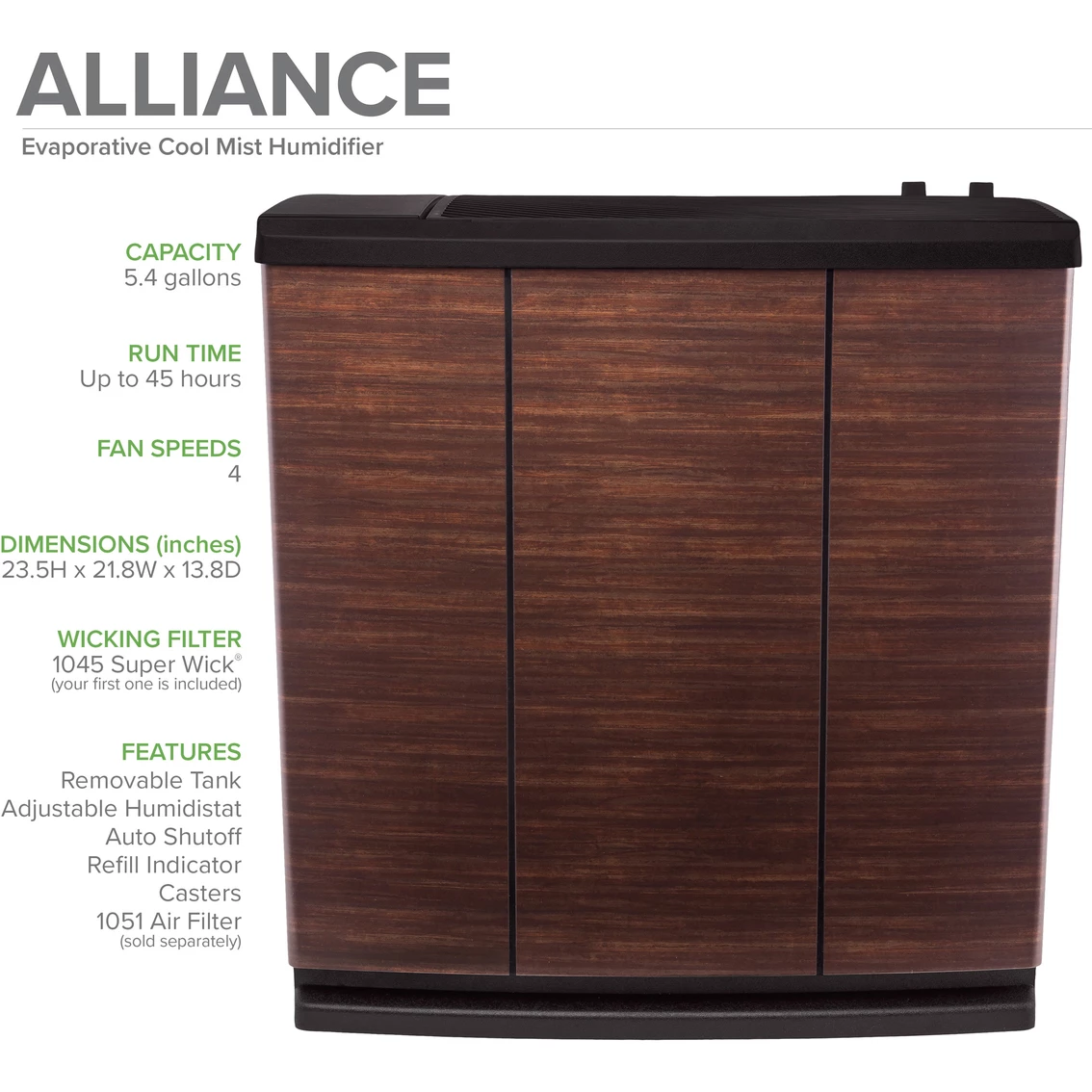 This Aircare Whole House Console Evaporative Humidifier for 3700 sq. ft. in Copper Nights finish has a 5.4-gal. water capacity, runs up to 45 hours per filling. Aircare humidifiers are made to look great in any room, in any home. But they’re more than just good looks. Aircare humidifiers really care for your air. Whether you need a cool mist evaporative humidifier for your whole house, a warm mist ultrasonic humidifier for your baby’s nursery, or a steam humidifier to help soothe flu symptoms, Aircare has a humidifier with the right mist to keep you comfortable. Model: H12 600.