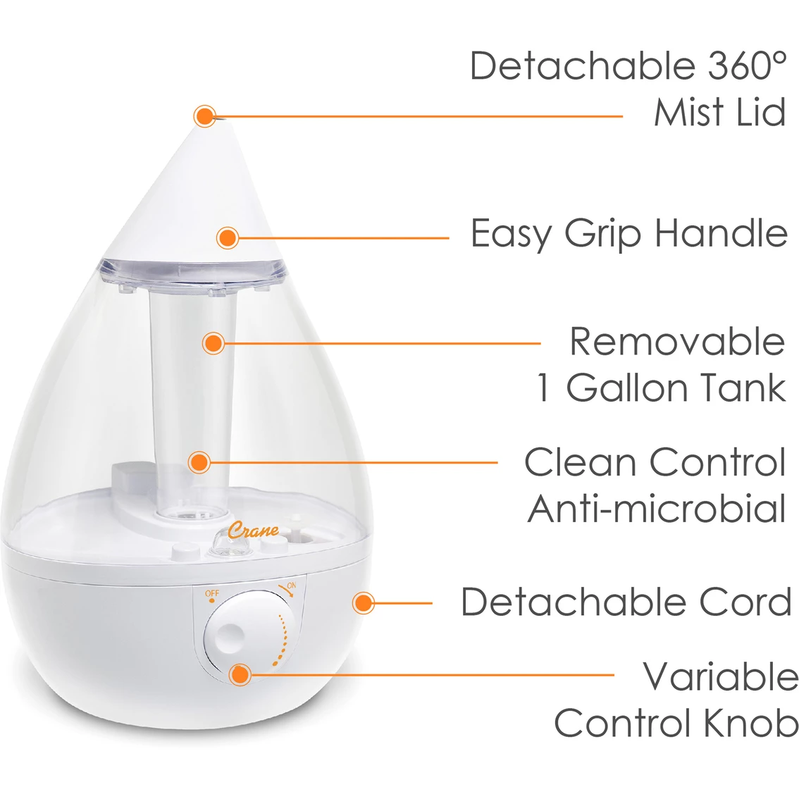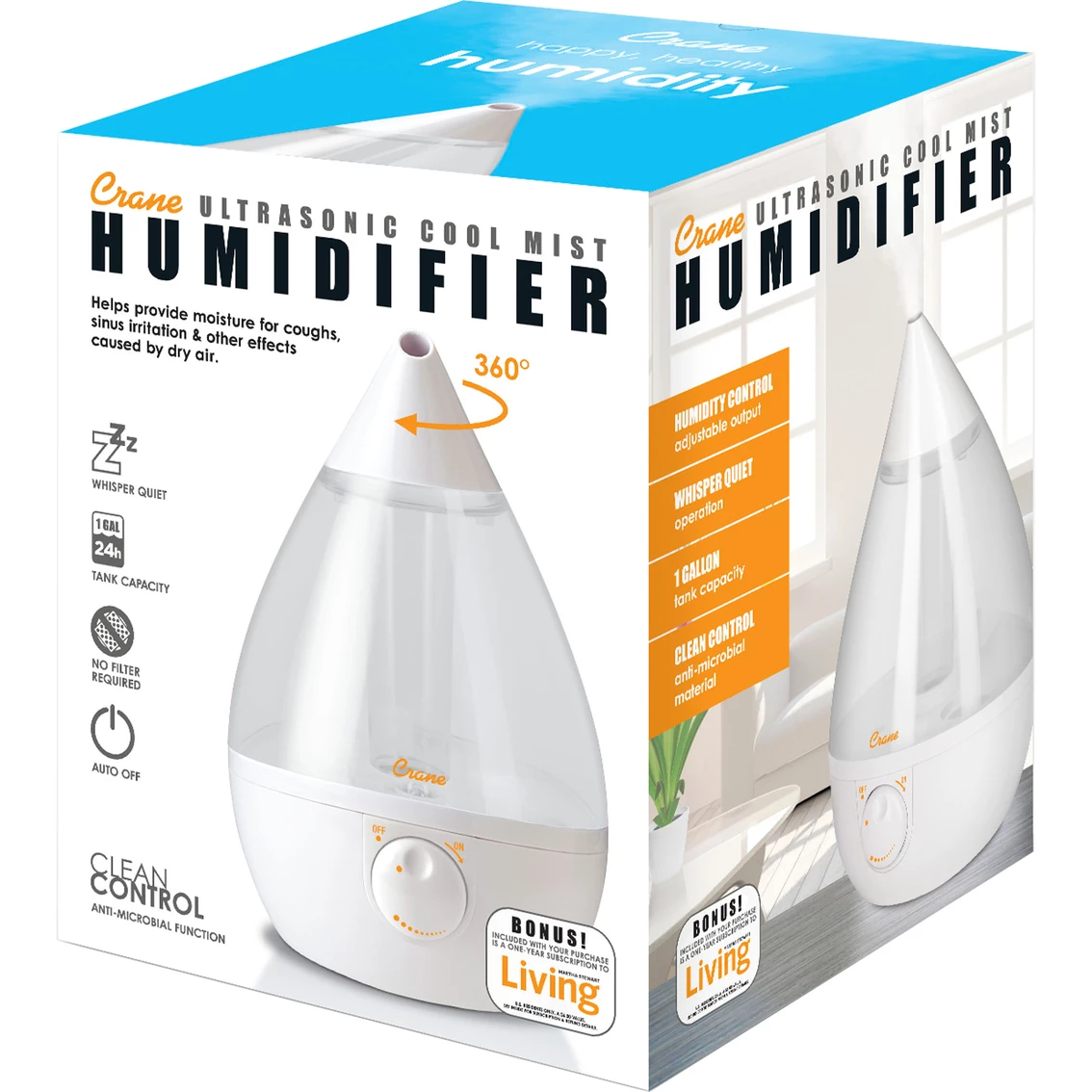 Get relief from cold and flu symptoms and bring wellness to your entire family in style with a Crane USA Drop Humidifier. With an award winning design and top rated performance, Crane’s 1.0 Gal. Drop ultrasonic cool mist humidifiers provide up to 500 sq. ft. of coverage and 24-hours of soothing moisture to help relieve the effects of dryness and congestion. This unit is an all-natural, non-medicated relief from dryness, cough, cold and flu symptoms, helping you and your family breathe easy and sleep through the night peacefully. Model: EE-5301CW.