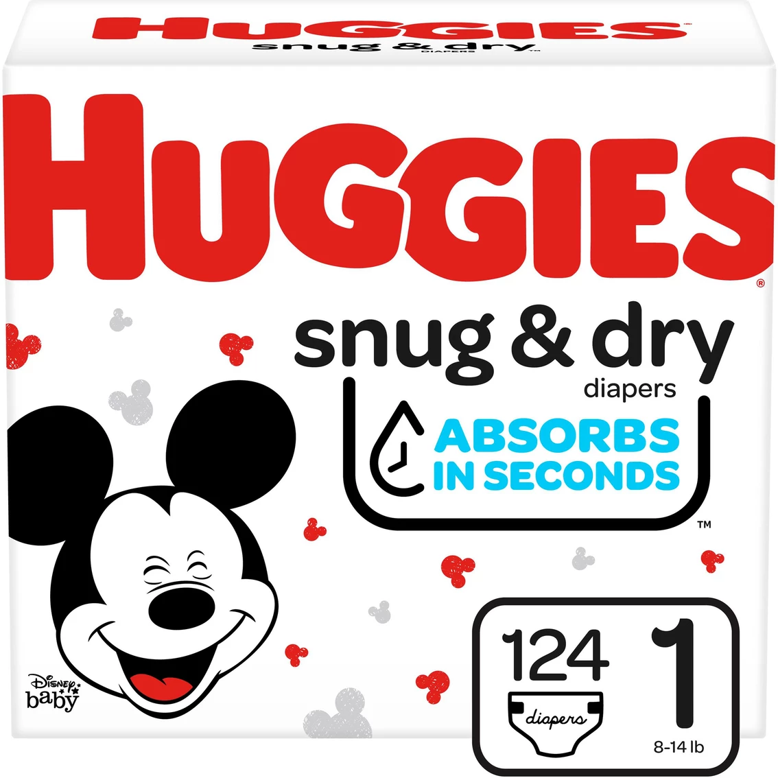 Huggies Snug and Dry Diapers give baby up to 12 hours of long-lasting protection with Huggies’ trusted Leak Lock System. Featuring new and improved leakage protection,* Snug and Dry diapers absorb wetness in seconds, helping to separate moisture from baby’s sensitive skin. Snug and Dry Diapers have a contoured shape for better leakage protection while baby is sleeping, crawling and walking. They also come with a wetness indicator that changes from yellow to blue when baby is ready for a diaper change. Snug and Dry disposable diapers are hypoallergenic, fragrance free and free of parabens, elemental chlorine and natural rubber latex. Now Featuring fun Disney Mickey Mouse designs. Style: 51530-2.