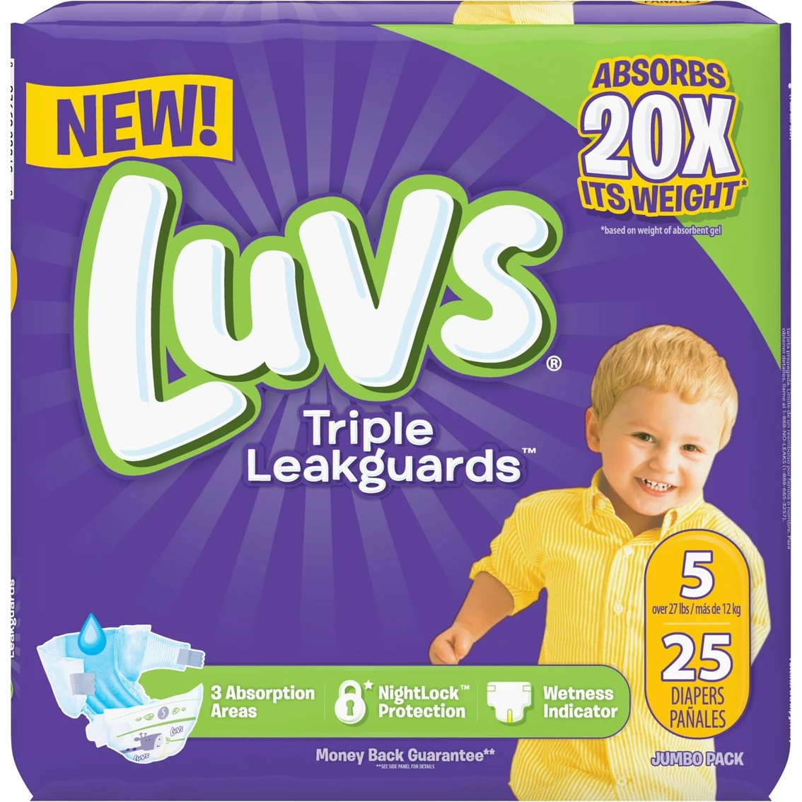 Stop leaks around the clock with Luvs. Designed with Triple Leakguards, Luvs can absorb 20x its weight and features a wetness indicator that turns blue when wet. When it comes to bedtime, Luvs Nightlock Technology works to lock away wetness so your baby can dream on. For complete comfort, Luvs diapers are super soft on your baby’s skin with a comfy feel, plus they’re designed with larger, refasten-able tabs for a secure fit. So try ’em and luv ’em, and if you don’t, Luvs offers a money-back guarantee.