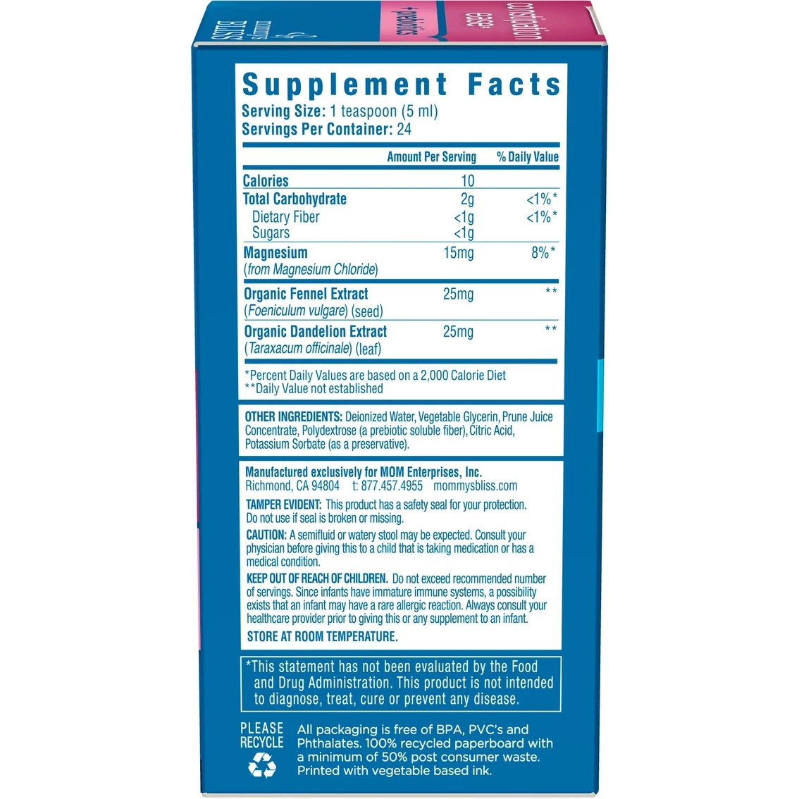 Mommy’s Bliss Constipation Ease is great for helping ease your little one’s tummy troubles. Recommended to help with colic, constipation and gas, this prebiotic formula contains fennel extract to reduce stomach discomfort and bloating. It doesn’t contain any alcohol, parabens, artificial flavors or colors, dairy, gluten or soy.