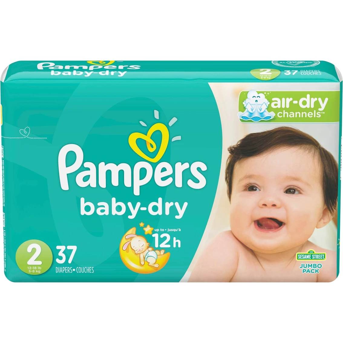 Pampers Baby-Dry diapers are 3x drier and feature Pampers’ exclusive Air-Dry Channels for up to 12 hours of overnight dryness. They are crafted of cottony-soft material with 5 layers of protection on the inside, and they feature a color-changing Wetness Indicator along with fun Sesame Street designs on the outside. Model: 86209.