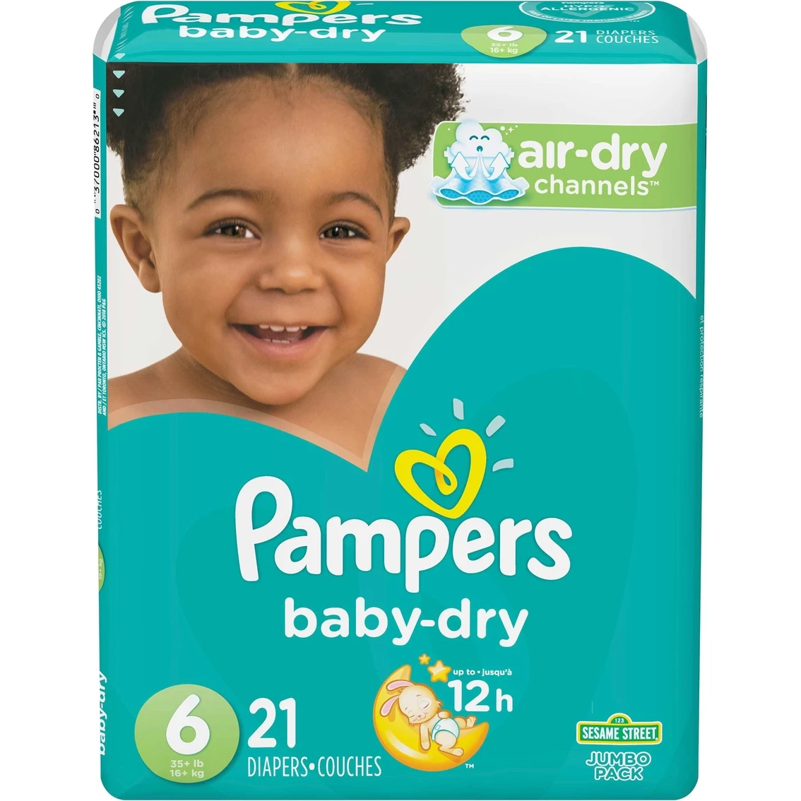 Pampers Baby-Dry diapers are 3x drier and feature Pampers’ exclusive Air-Dry Channels for up to 12 hours of overnight dryness. They are crafted of cottony-soft material with 5 layers of protection on the inside, and they feature a color-changing Wetness Indicator along with fun Sesame Street designs on the outside. Model: 86213.