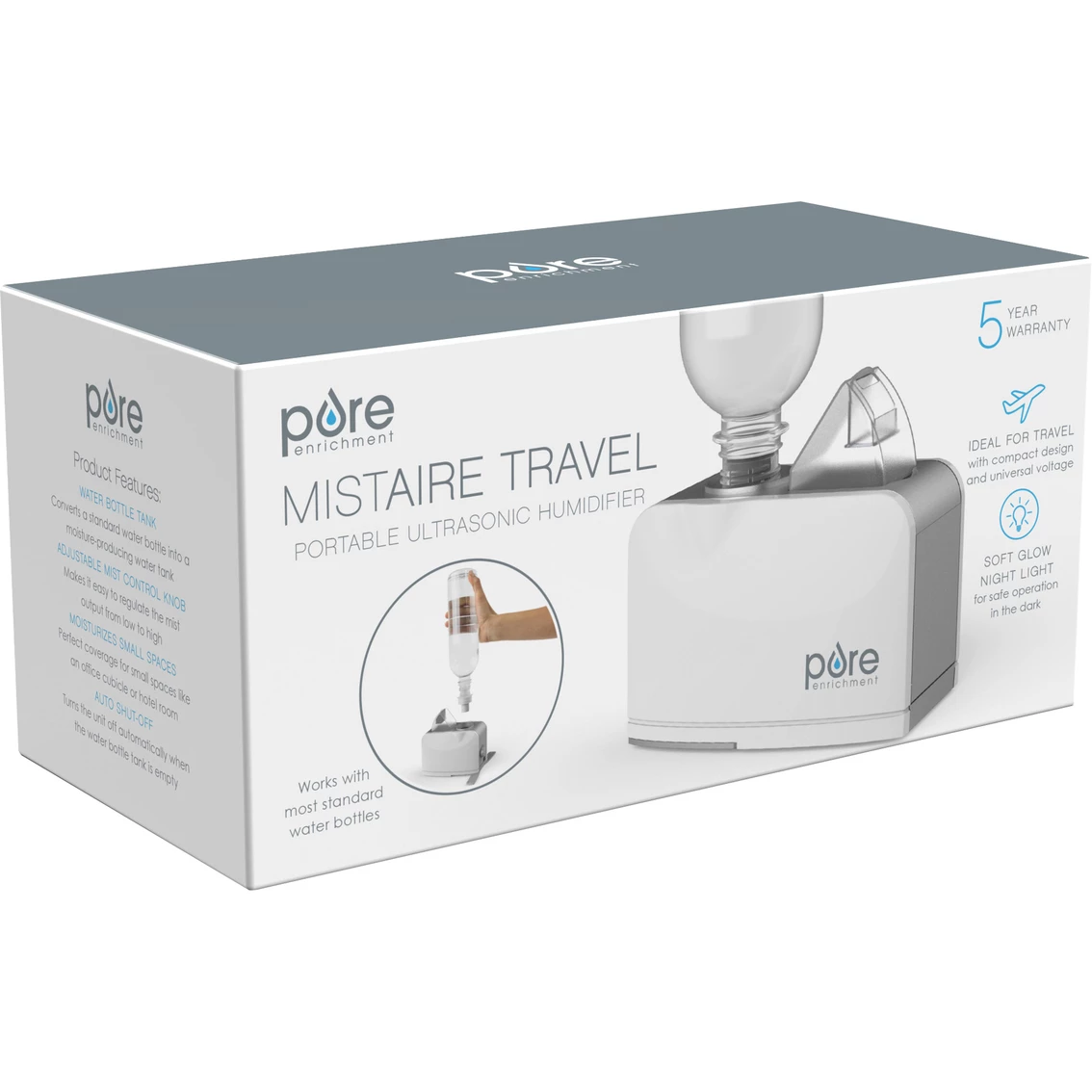 No matter where you go, the MistAire Travel Ultrasonic Humidifier from Pure Enrichment makes it easy to moisturize the dry air in your personal space. The portable tabletop humidifier is compact enough to fit inside your carry-on luggage for quick set up in your hotel room when traveling. It also mists quietly for up to 6 hours on a single 16.9 oz water bottle, making it perfect to use in a small nursery or office. Note: MistAire Travel features a soft blue mood light. Most users find the light to be relaxing and useful for overnight operation. However, if youβre sensitive to light while sleeping, please note the light cannot be turned off. Whatβs In the Box -Mini Ultrasonic Humidifier -AC Adapter -Bottle Base -Cleaning Brush -Storage Bag Product Specifications Size: 5.6β x (L) x 3β (W) x 3.5β (H) Power Supply: AC: 100V-240V, 50/60Hz DC: 24V Max Room Coverage: 160 sq. ft. Max Run Time: Up to 6 hours per bottle* Recommended Bottle Tank Volume: 16.9 oz. (.5 Liters) β Not Included Avg. Moisture Output: 2.7 oz. per hour *Run time may vary depending on water quality, room temperature and bottle size. Model: PEHUMINI-2.
