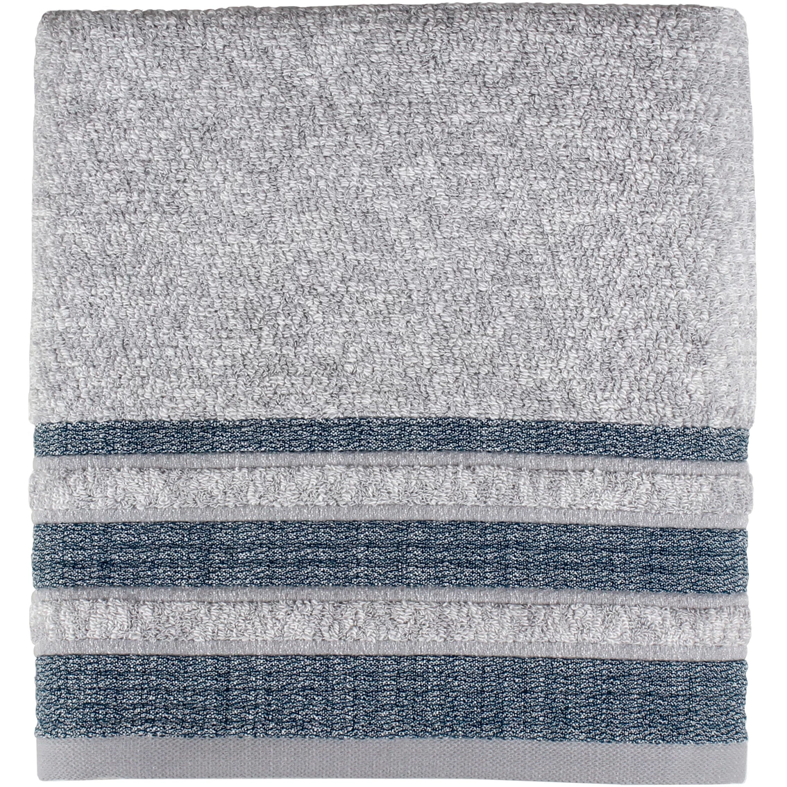 The Saturday Knight LTD Cubes Bath Towel is modern and clean with a heathered gray and cream towel body with a five in. woven in textured band at the end hem. The band has wavy stripes raised above the design in heathered gray with cream and heathered blue with cream. Style: T4285910805103.