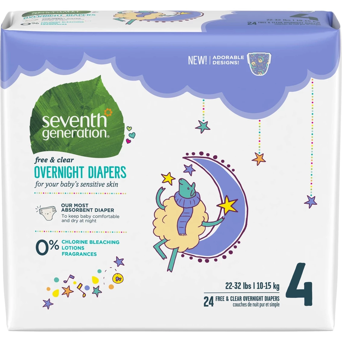 Everyone could use a little sleep. Seventh Generation Free & Clear Overnight Diapers feature the most absorbent core specially designed to keep baby protected and dry all night long. The bedtime diaper’s fluffy, high capacity core is made with FSC certified sustainably sourced wood fluff pulp (FSC C115279). Seventh Generation is working to promote environmentally sound and socially beneficial management of the world’s forests. The NEW Protection for All design features an adorable friend, Sylvia the Sheep, and a rich color pattern making it easy to tell nighttime diapers from regular diapers. Seventh Generation Free & Clear Diapers are made for baby’s sensitive skin and contain 0% chlorine bleaching, lotions or fragrances β you and your parents can sleep easy, baby.