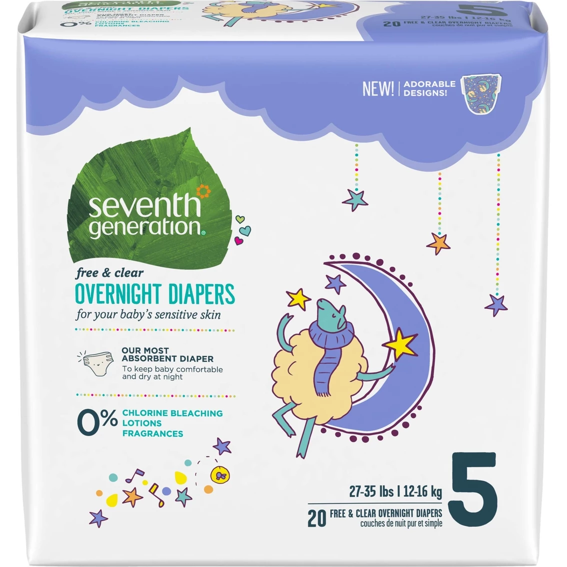 Everyone could use a little sleep. Seventh Generation Free & Clear Overnight Diapers feature the most absorbent core specially designed to keep baby protected and dry all night long. The bedtime diaper’s fluffy, high capacity core is made with FSC certified sustainably sourced wood fluff pulp (FSC C115279). Seventh Generation is working to promote environmentally sound and socially beneficial management of the world’s forests. The NEW Protection for All design features an adorable friend, Sylvia the Sheep, and a rich color pattern making it easy to tell nighttime diapers from regular diapers. Seventh Generation Free & Clear Diapers are made for baby’s sensitive skin and contain 0% chlorine bleaching, lotions or fragrances β you and your parents can sleep easy, baby.