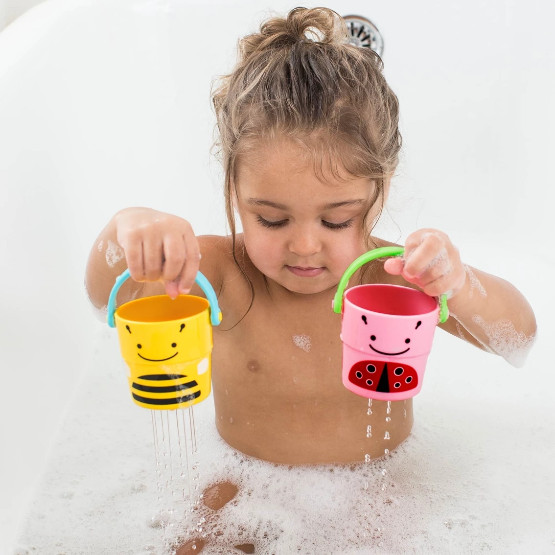 Stack, fill and pour with these easy-grab buckets featuring signature Skip Hop Zoo characters. These five friendly-faced nesting buckets have three different sprinkle effects for bath time fun. Perfectly sized for little hands, they provide endless tub time play while helping to build motor skills. Kids can drain water in a variety of ways, then stack and store when bath time’s done. PVC-free and Phthalate-free. Model: 235355.