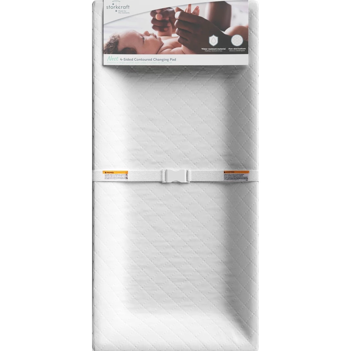 The Storkcraft Nest 4-Sided Contoured Changing Pad is designed to make changing your baby a secure, comfortable and clean process that will provide you with enhanced nursery convenience. It is made with durable, water-resistant PEVA material that is designed to be easily wiped clean and keep your baby dry. This durable, water-resistant changing pad features four contoured sides, as well as a safety belt, for your baby’s added security when placed on the changing pad. The pad also includes two straps, allowing you to secure it to your safe changing surface of choice, as well as a non-skid bottom to help keep the changing pad securely in place.